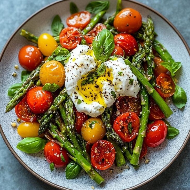 Organic Paster Raised chicken eggs, asparagus,asiago cheese and loquats.